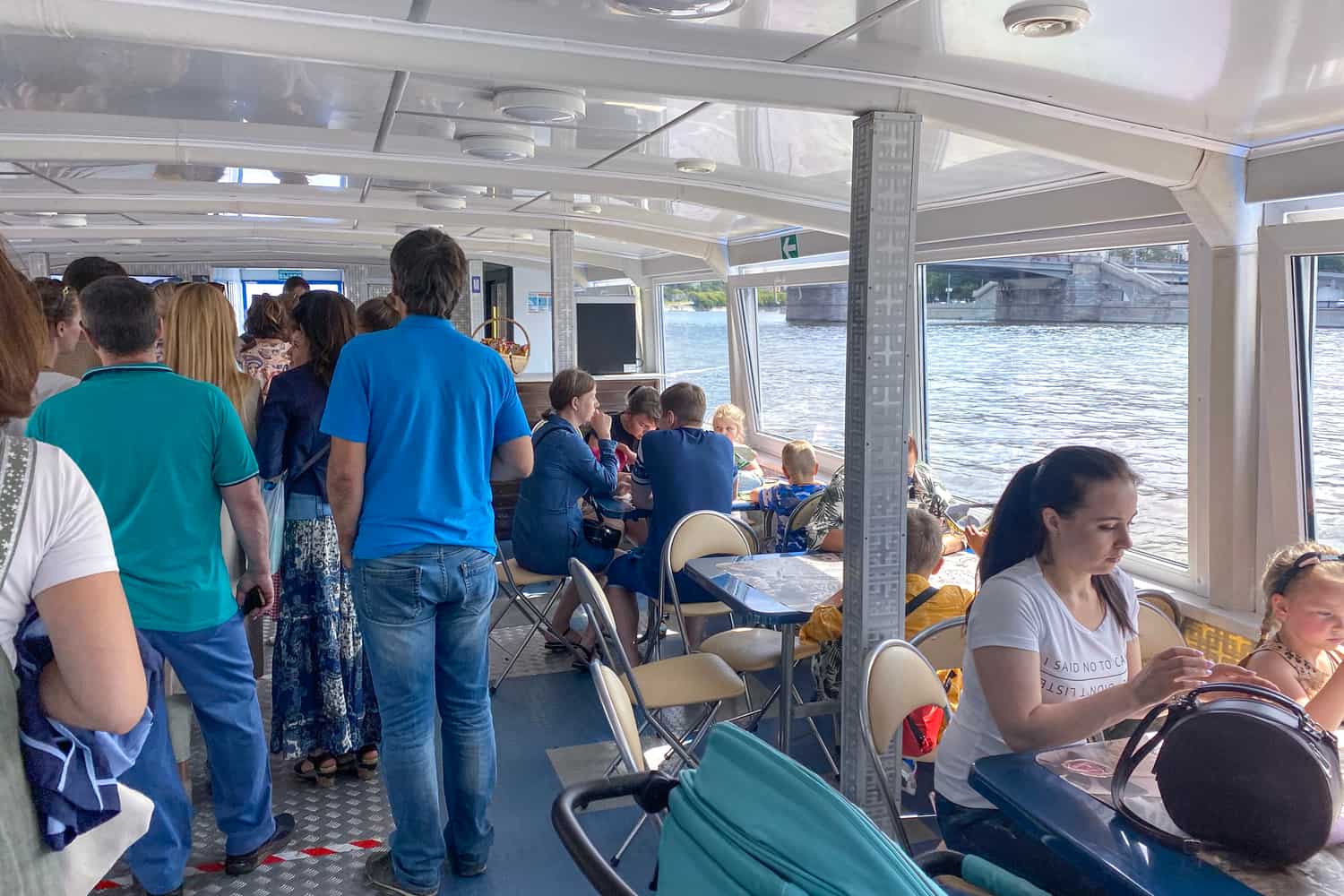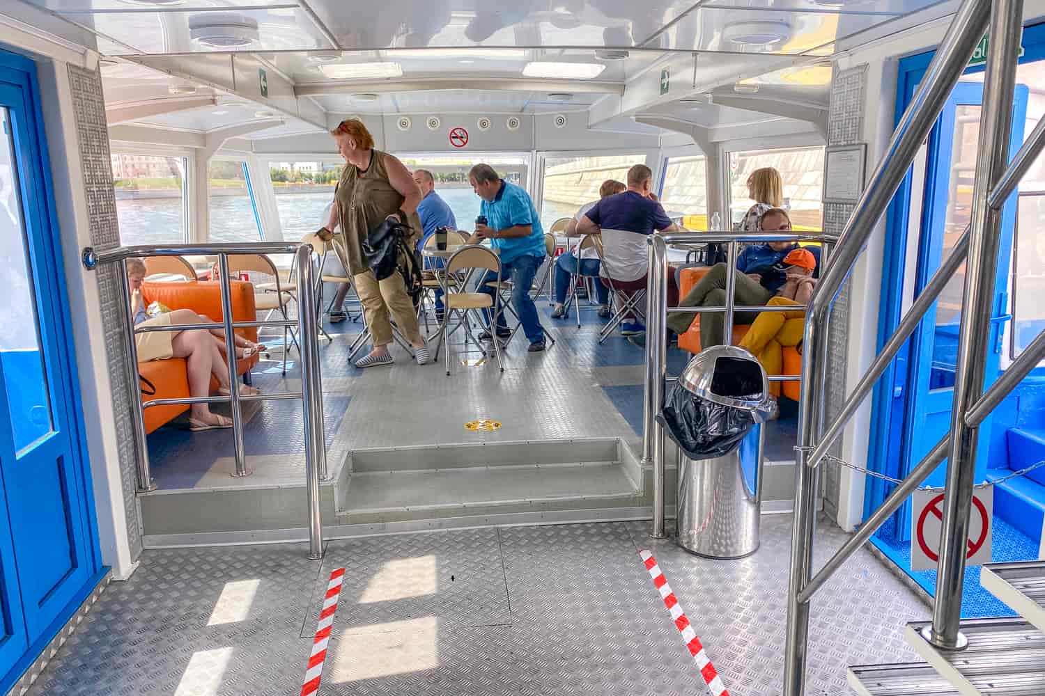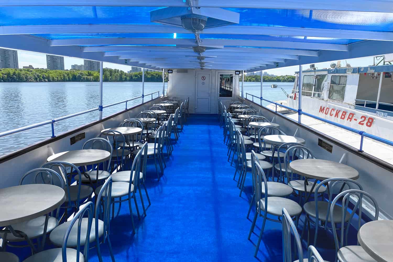 Гости теплоходов могут размещаться в закрытом салоне на главной палубе с большими обзорными окнами, комфортная температура здесь поддерживается климатической системой, либо на открытой палубе над которой оборудован тент для защиты от осадков.