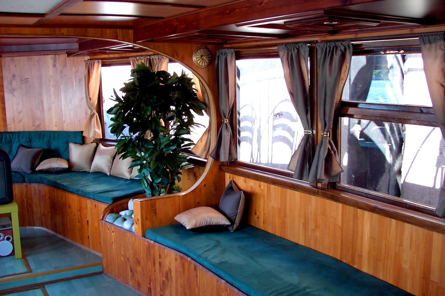 На судне две палубы. На нижней расположен крытый салон для пассажиров. На верхней палубе – открытая площадка с местами для сидения в носовой части судна, а на корме — площадка под тентом, защищающим от непогоды, где также установлены стулья. На борту работает бар с горячими и холодными закусками, снеками и десертами, с большим выбором напитков.