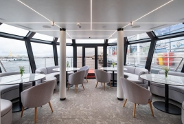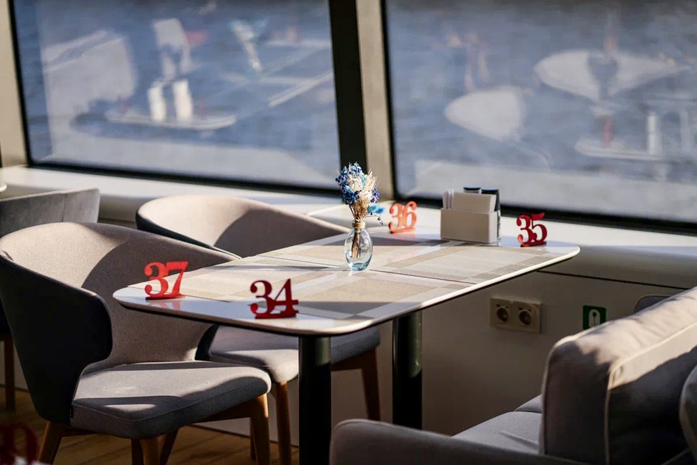 Внутри предусмотрены стильные тёплые салоны с удобной посадкой, панорамное остекление и климат контроль. Для видов и фото есть открытые палубы, аудиосистема поддерживает комфортную атмосферу. На борту работают ресторан и бар, поэтому прогулку легко совместить с ужином на воде.