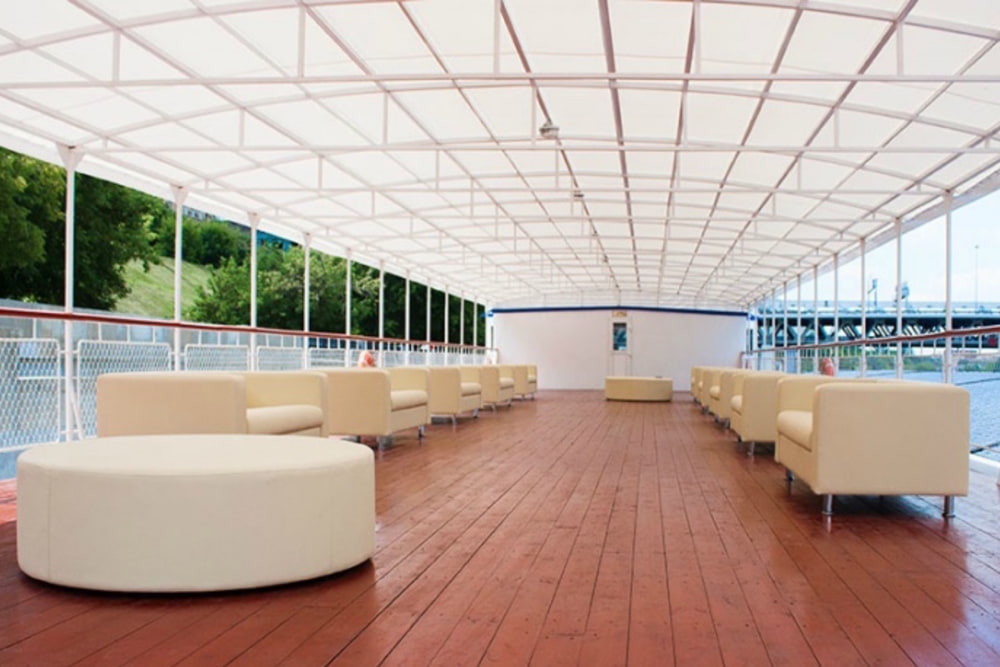 И, конечно, для всех гостей теплохода «Ривьера» работает ресторан с обслуживанием и бар. Вы можете расположиться за столиками и наслаждаться концертом, вкусной едой и прохладительными напитками. С палубы теплохода открываются красивые виды на вечернюю столицу, поэтому красочные фотографии на память Вам обеспечены!