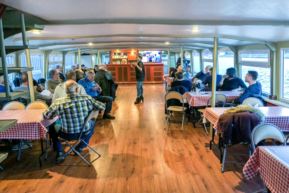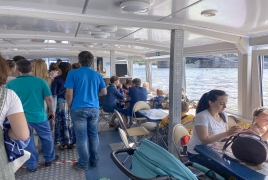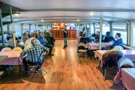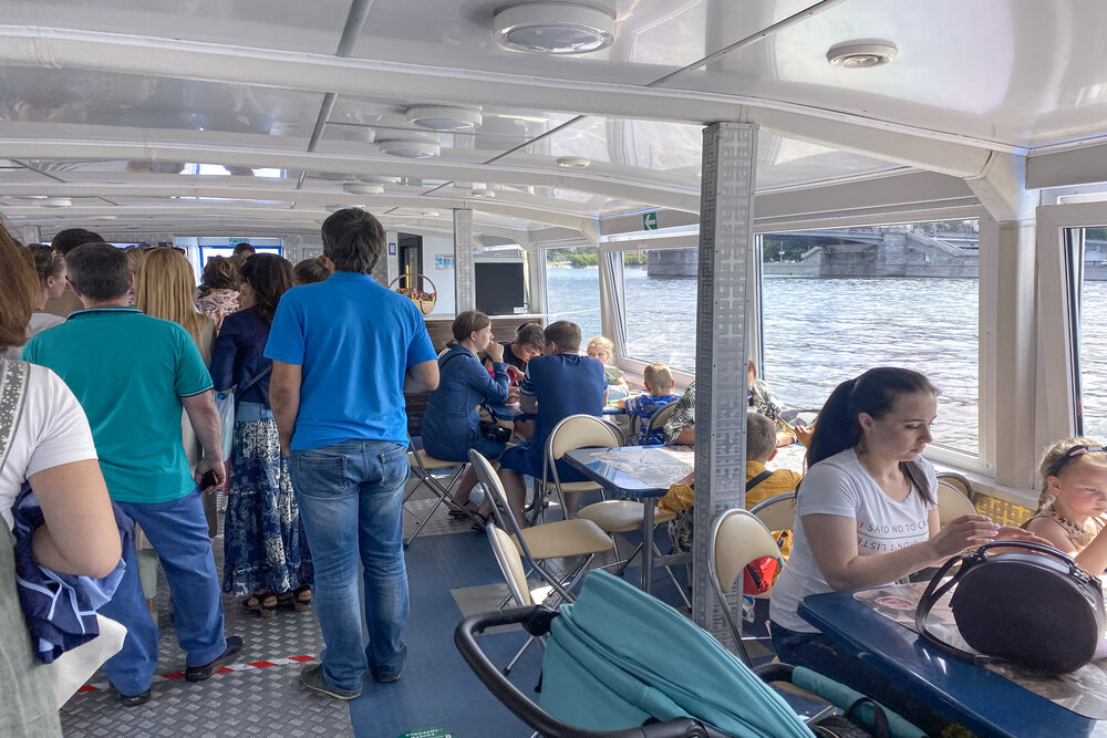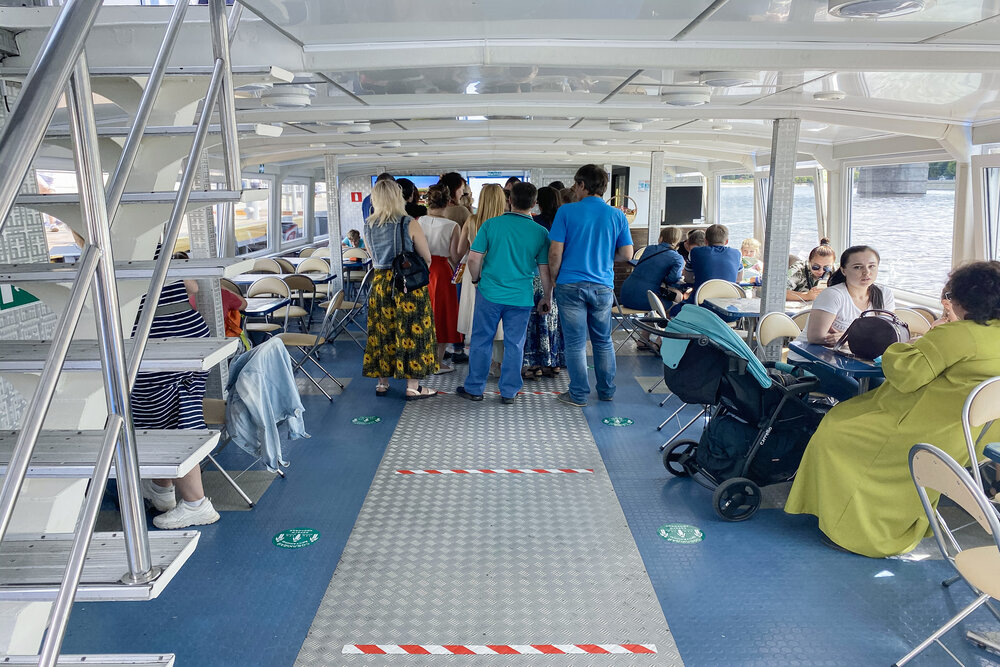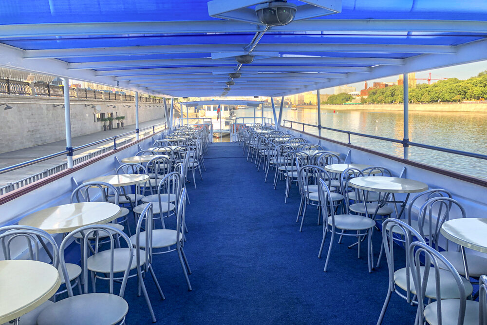 На открытой палубе теплохода большая панорамная площадка, звучит приятная музыка, на нижней палубе в течение всей прогулки работает бар с широким ассортиментом закусок и напитков.