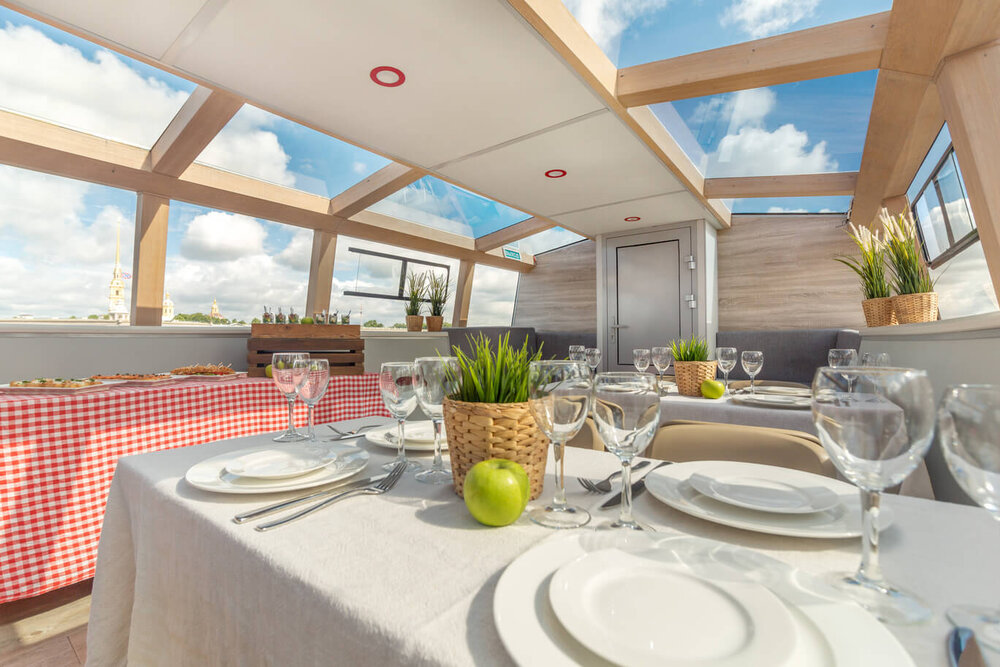 На борту звучит приятная музыка, создавая атмосферу праздника и поднимая настроение всем гостям.
