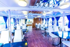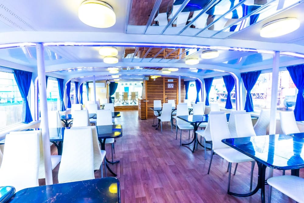 Строился теплоход «Москва-84» для кратковременных прогулок и речных перевозок, поэтому кают в нем не предусмотрено. Верхняя палуба открытого типа делится на две зоны, одна из них оснащена тентом для защиты от солнца и дождя. Здесь же в носовой части расположена ходовая рубка. На открытой части палубы и под тентом размещены жесткие скамейки, где пассажиры могут располагаться во время прогулок.