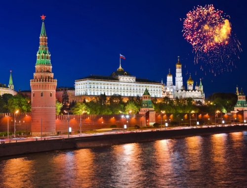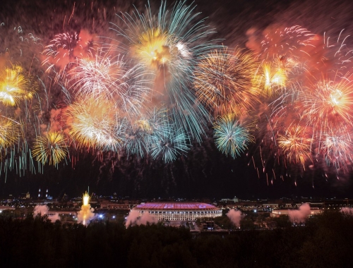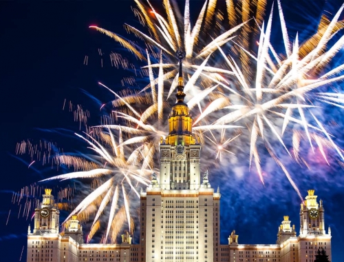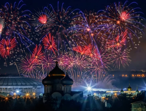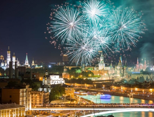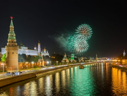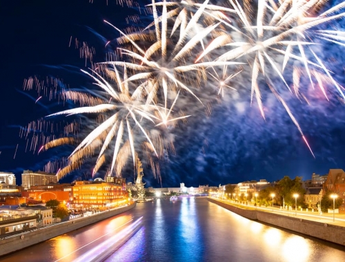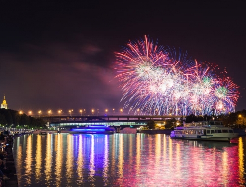 Вечером в самом сердце Москвы, на набережной реки Москва, происходит просмотр салюта. Теплоход становится платформой, предоставляющей удивительную возможность наблюдать за фееричным зрелищем. Яркие вспышки и разноцветные огни на ночном небе создают впечатляющую и необыкновенную картину.