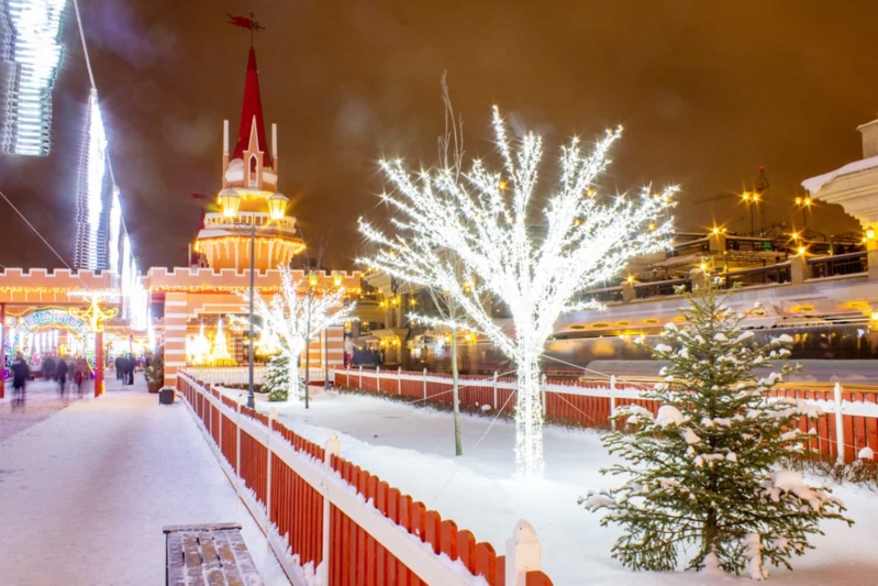Город в это время года превращается в яркую зимнюю сцену: огни гирлянд подчеркивают архитектуру, заснеженные улицы наполнены оживлённой праздничной атмосферой.